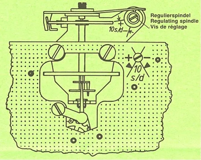 Picture 3 showing the regulator for adjusting the timekeeping. The screw at the very top right is turned with a screwdriver. Make only a small adjustment each time (about 1/16 of a turn).